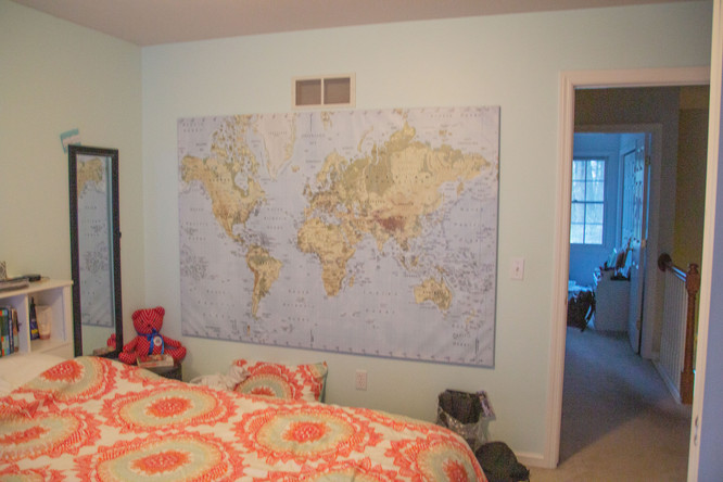 My room is situated at the top of the staircase, with a direct view out of the front glass door to the benign, lackluster suburb in which my parents house resides. Though the wooden door to my room often blocks this view, it is comforting to know it exists. Once inside, and a 90º turn to your right, you are confronted with a large scale map of the world where one can immerse themselves in the knowledge of new places. I often wake up in the morning and gaze upon it, dreaming of traveling to these distant lands once home confinement has ceased.